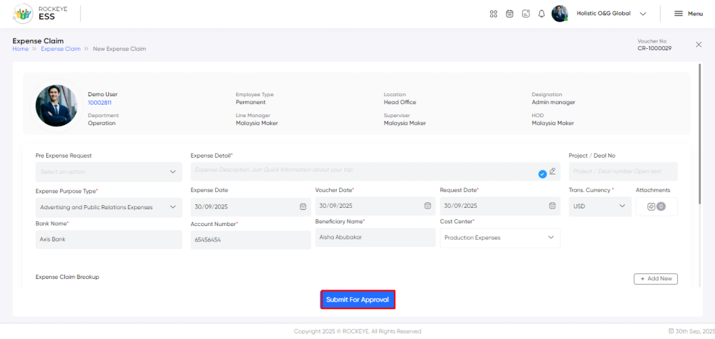 - Voucher Date*: The date on which the expense claim voucher was generated or submitted.