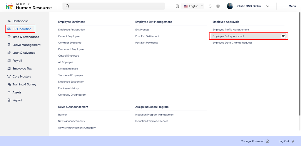 - Click on the main navigation icon which is located on the top right corner of the screen then click on the HR operation section which is located on the left side menus on the screen.