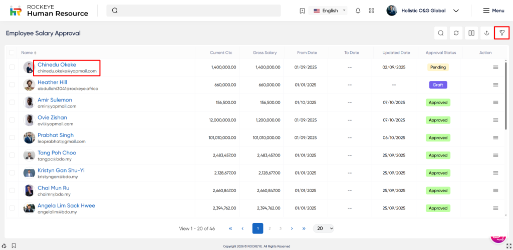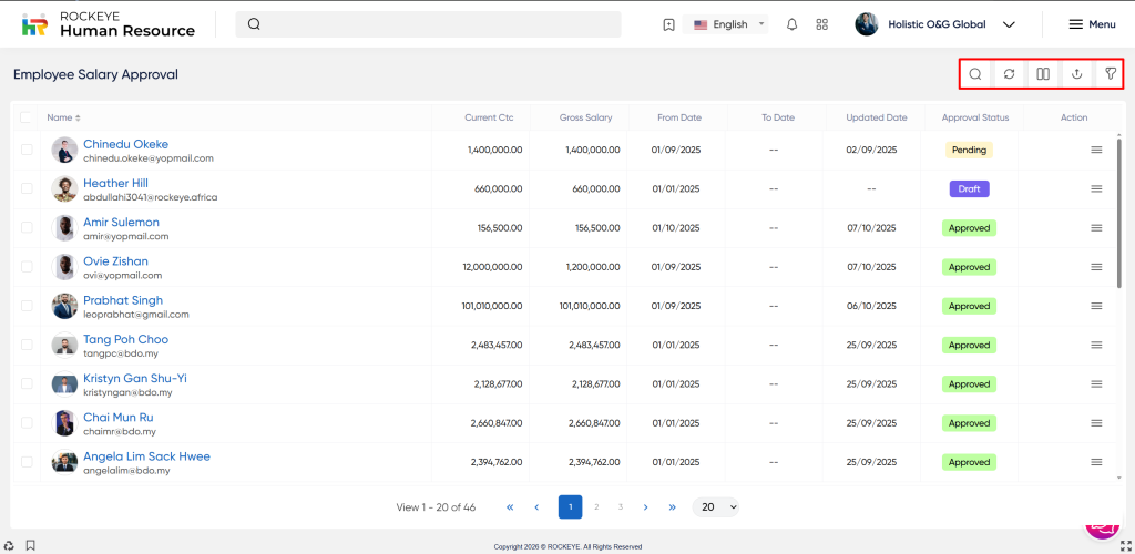 The Employee Salary Approval allows users to view all approved & pending Employee Salary Approval. The key features of the Employee Salary Approval listing is included below: