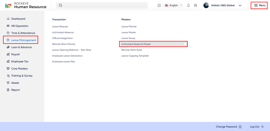 - Click on the Authorized Absence Master: The authorized absence master section is located in the masters under leave management. After clicking on this link you can navigate authorized absence master listing.