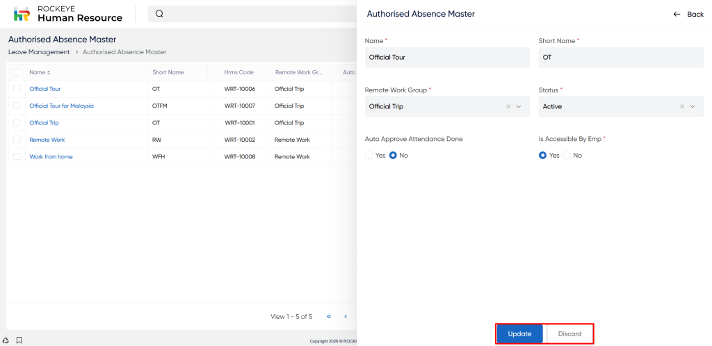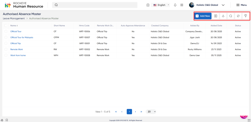 Users can add new authorized absence master by clicking the “Add new” button and fill the required fields.