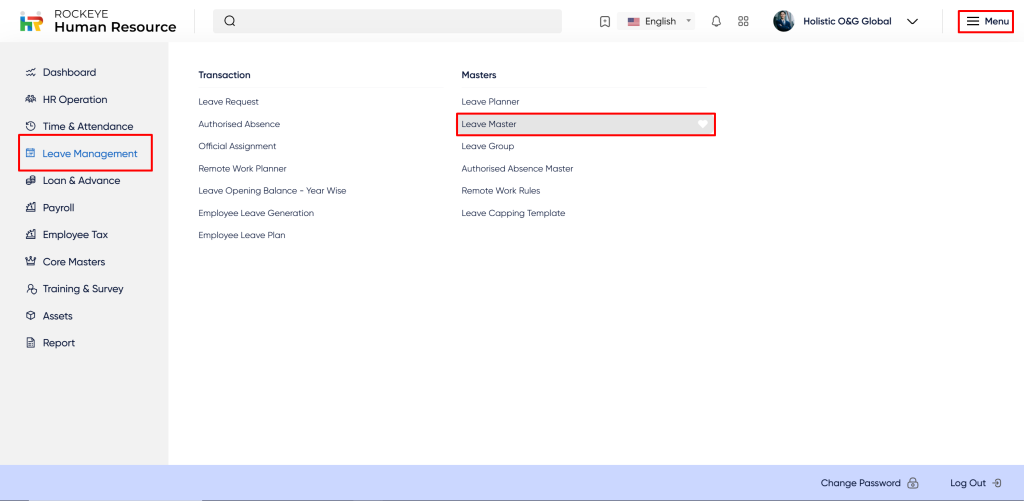 • Click on the main navigation icon: The main navigation icon is located on the top right corner of the screen then click on the Leave Management section which is located on the left side menus on the screen.