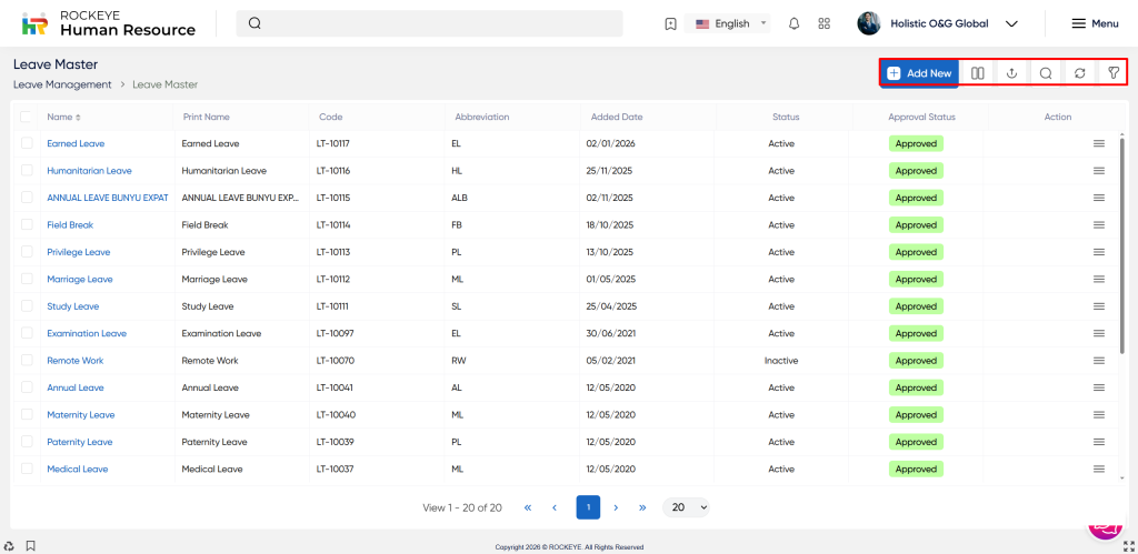 The leave master allows users to view all approved & pending leave master records. The key features of the leave master listing are included below: