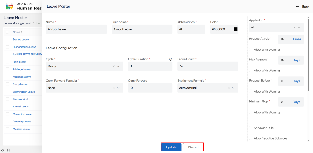• Edit: On clicking the edit option, the user will be able to edit the Leave Master record.
