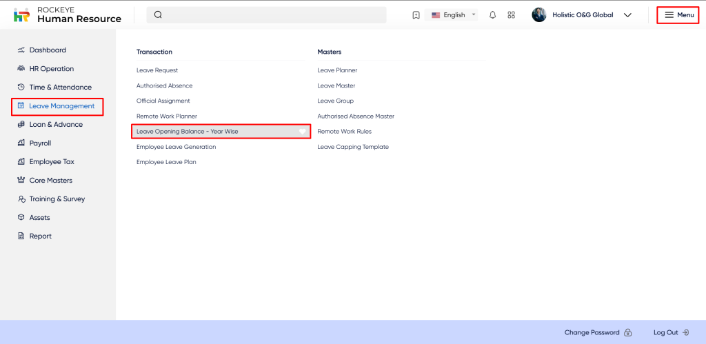 - Click on the leave opening balance: The leave opening balance section which is located in the Transactions under Leave Management. After clicking on this link you can navigate Leave Opening Balance Listing.