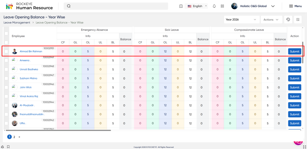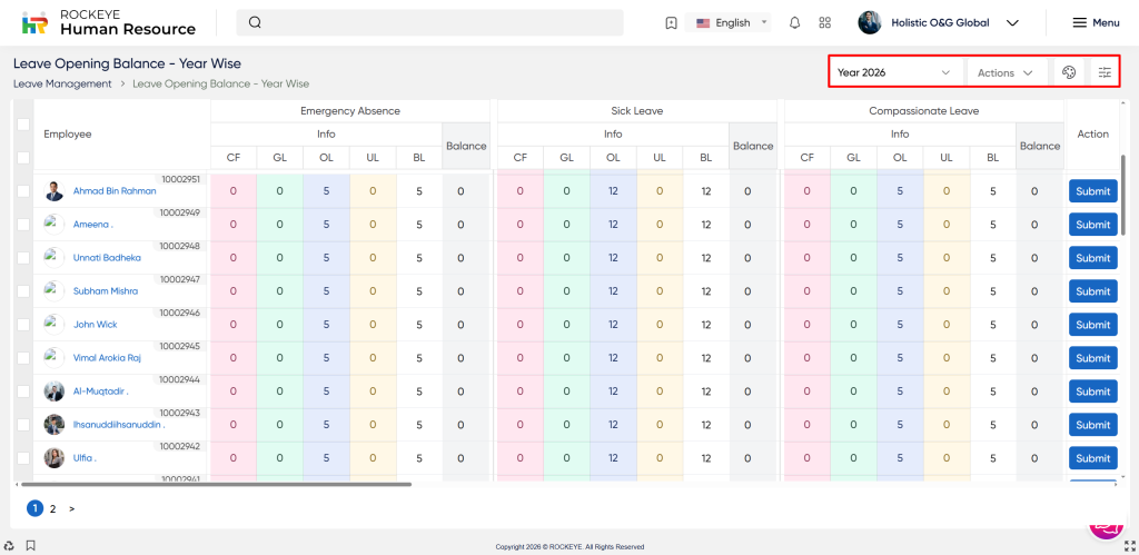 The leave opening balance listing allows users to view all approved & pending leave request records. The key features of the leave opening balance listing are included below: