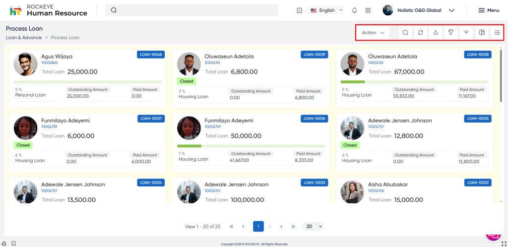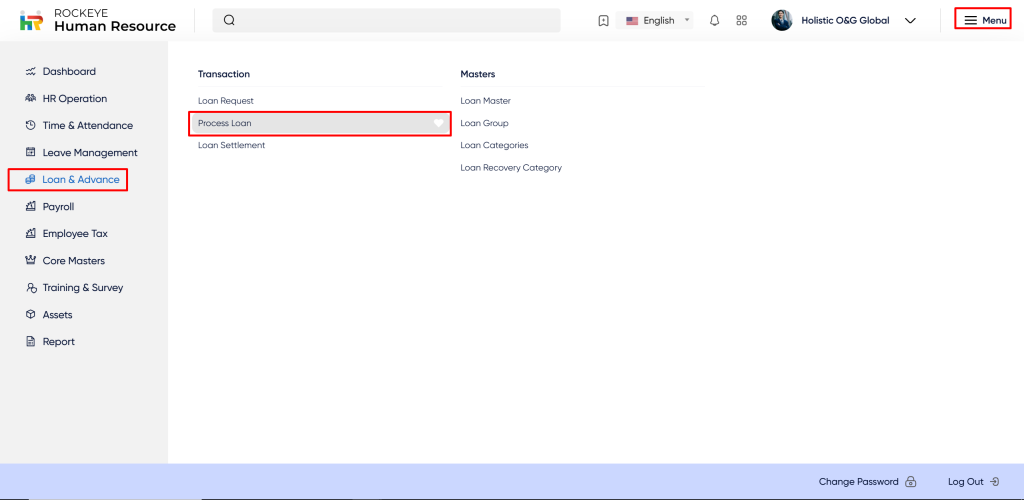 - Click on the Loan & Advance section: The Process loan is located under the transaction section. By clicking on the process loan, it will display an employee code, name, request code, loan name, interest rate, request approval by, request approval date, total amount, outstanding amount, paid amount, approval status and action.