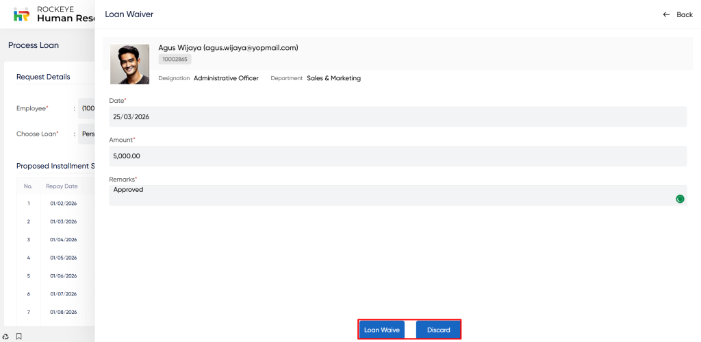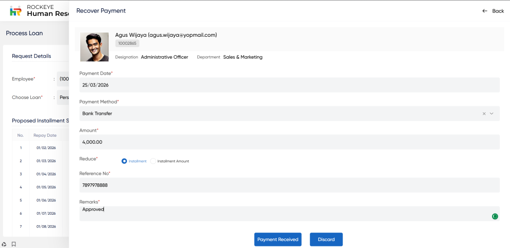 The Process Loan module in HRMS (Human Resource Management System) is designed to streamline the loan management and disbursement process within an organisation. The purpose of the process loan module is to disburse the loan amount within the system.It also includes the pre-payment, loan waiver, loan settlement, download receipt, change installment, pre-payment history and loan transfer.
