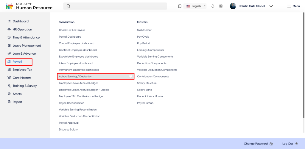 - Click on the Adhoc Earning/Deduction section which is located in the Transactions under Payroll. After clicking on this link you can navigate Adhoc Earning/Deduction record Listing.