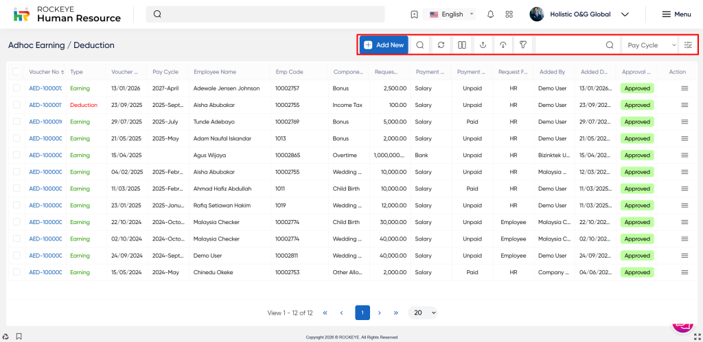 The Adhoc Earning/Deduction listing allows the user to view the all pending and approved Adhoc earnings and deductions. The key features of Adhoc Earning and Deduction is:
