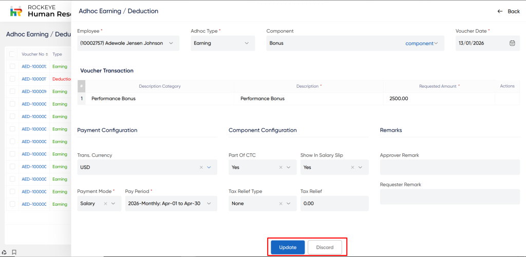 - Update: If the ad-hoc earning/deduction record is approved by the user then this option allows the user to update the ad-hoc earning/deduction record.