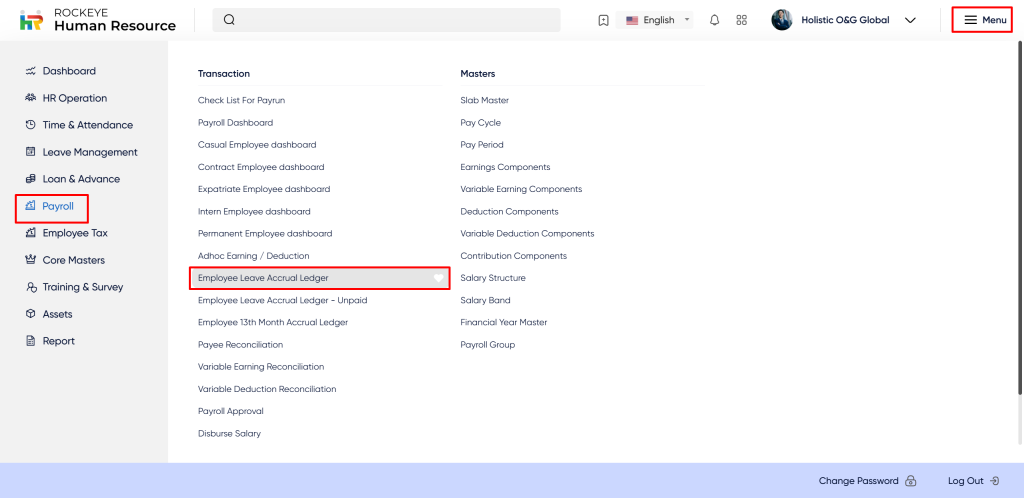 - Click on the Employee Leave Accrual ledger section which is located in the Transactions under Payroll. After clicking on this link you can navigate Employee leave Accrual ledger record Listing.
