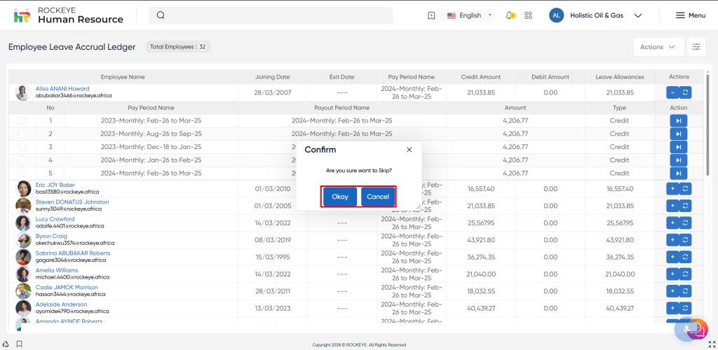 - Okay: This option allows the user to recalculate the employee leave accrual ledger record (if the user makes any changes, like skipping or adding the record).