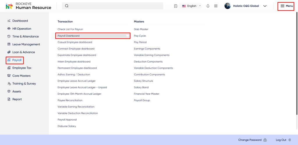 - Click on the main navigation icon which is located on the top right corner of the screen then click on the Payroll section which is located on the left side menus on the screen.