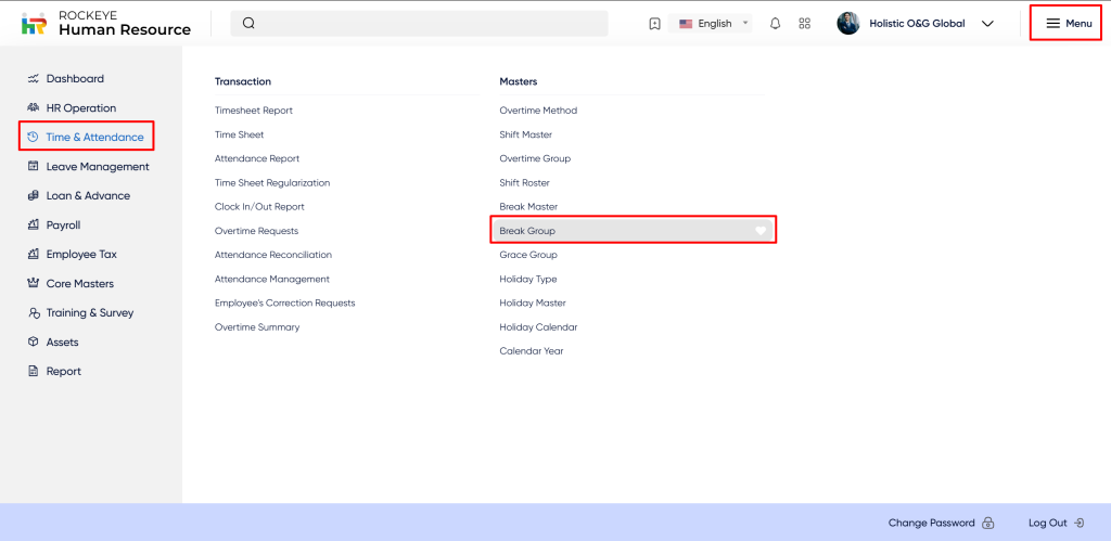 - Click on the Break Group section which is located in the Masters under Time and Attendance after clicking on this link you can navigate to Break Group Listing.