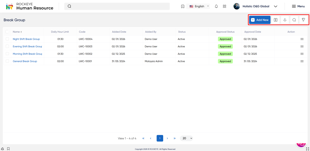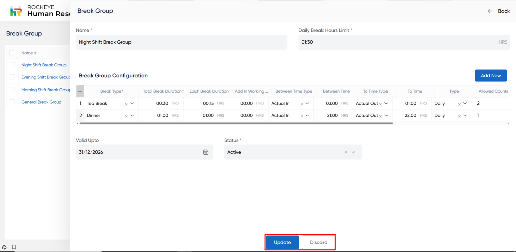 Users can Add a new Break Group by clicking “Add New” Button “ and fill the below field
