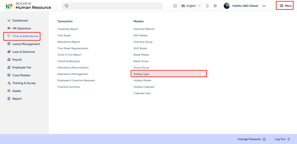 - Click on the Holiday Type section which is located in the Masters under Time and Attendance. After clicking on this link you can navigate to Holiday Type Listing.