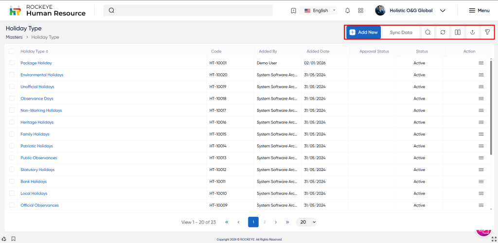 The Holiday Type listing allows users to view all approved & pending Holiday Type records. The key features of the access rights listing are included below: