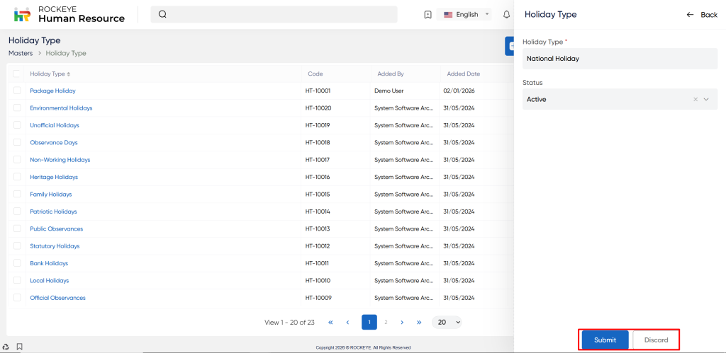 - Discard: This option allows the user to discard the Holiday Type record and does not change the selected record.