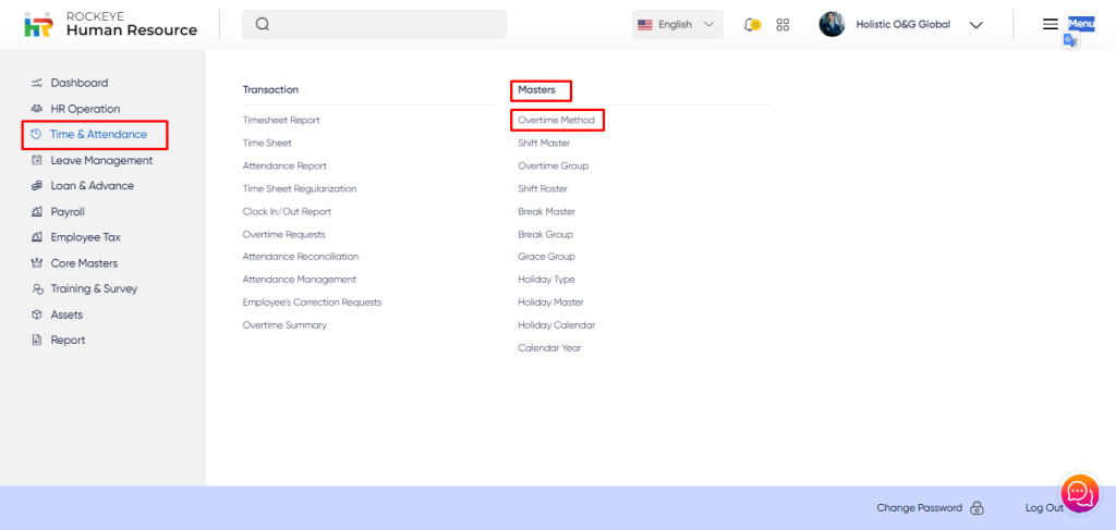 - Click on the Overtime Method section which is located in the Masters under Time and Attendance. After clicking on this link you can navigate to Overtime Method Listing.