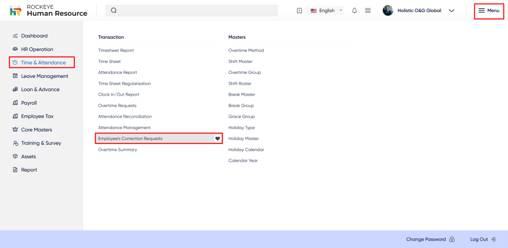 The navigation to record an Employee’s correction request in the HRMS system typically involves the following steps: