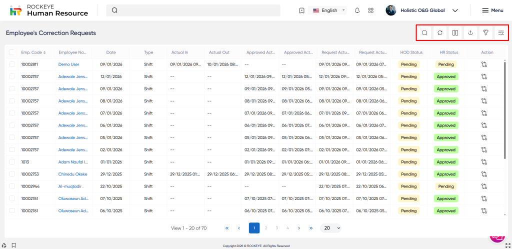The Employee’s Correction Request allows users to view all approved & pending employee requests. The key features of the Employee correction request record listing are included below: