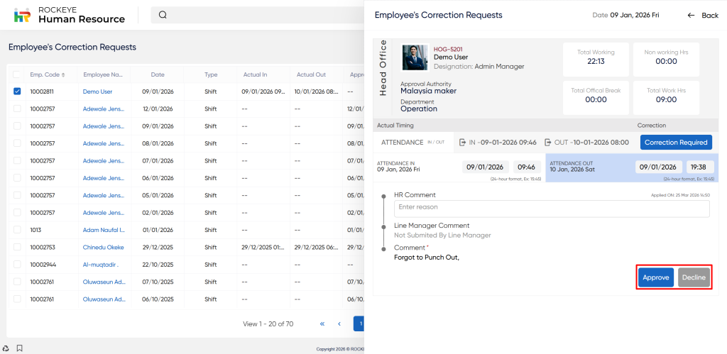 - The Employee’s correction requests have gone for approval to many levels such as Line Manager, HOD, and finally HR. If the request is pending from the HOD or Line Manager then the HR approves the correction request, and the correction request from the HOD and Line Manager is Bypass approved.