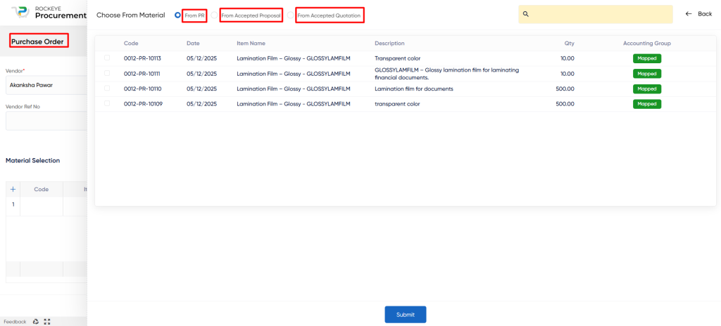 - Choose From Material: This field allows the user to create a Purchase Order from Purchae Requisition, Accepted Proposal, or Accepted Quotation. Based on the selected source transaction, the system pulls the eligible details into the Purchase Order so the user can proceed with the procurement flow and manage the ordered quantity against the selected reference transaction as shown in below screen.