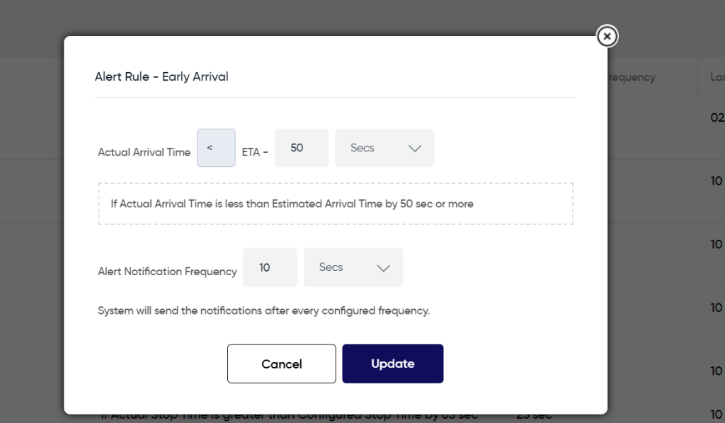 - In this above case, the system will notify the user for the early arrival as arrived 10 mins early and check for next early arrival after every 10 seconds as configured in frequency(“2”)