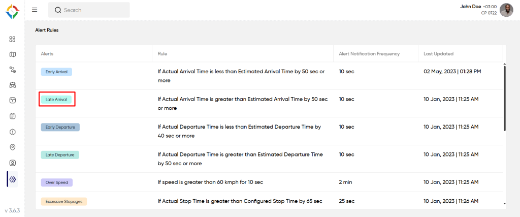 Users will get notified of the “Late Arrival” alert if the vehicle violates the defined rule. To know how to set the rule, follow the below steps.
