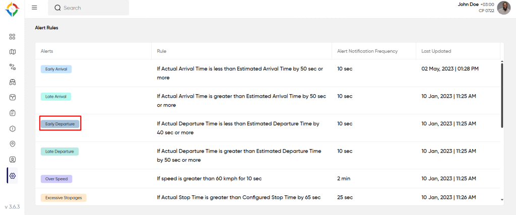 Step 1: Click on the “Early Departure” from the “Alert Rules” list screen as shown below: