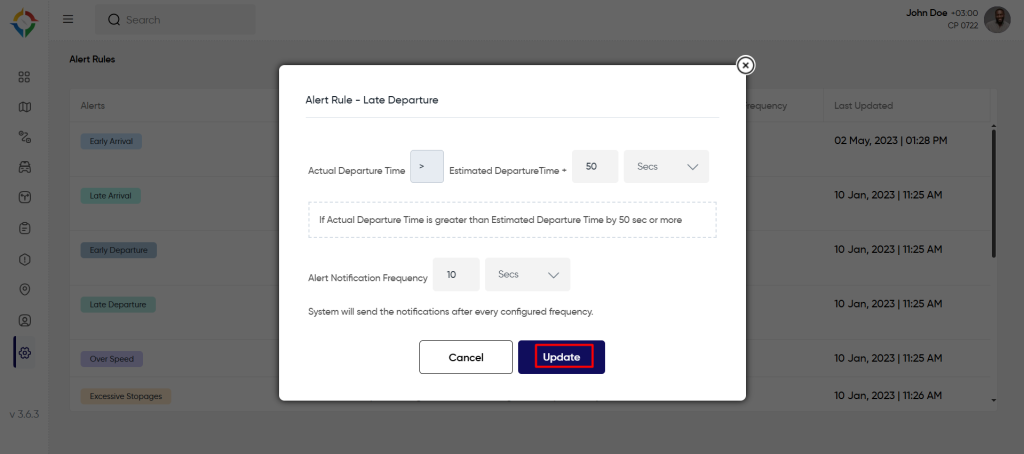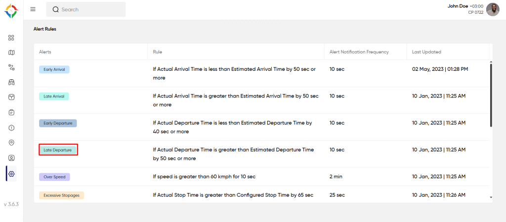 Step 1: Click on the “Late Departure” from the “Alert Rules” list screen as shown below: