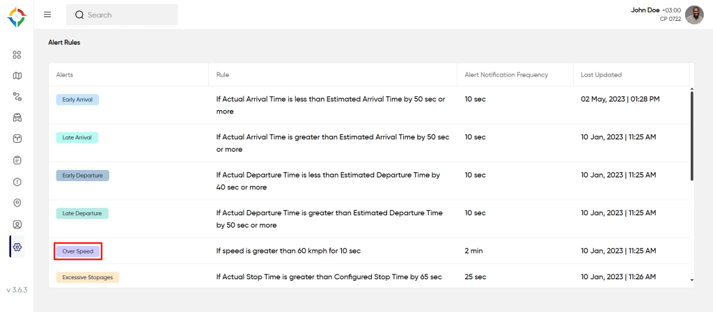 Step 1: Click on the “Overspeed” from the “Alert Rules” list screen as shown below: