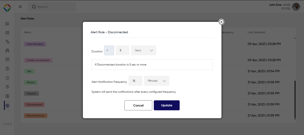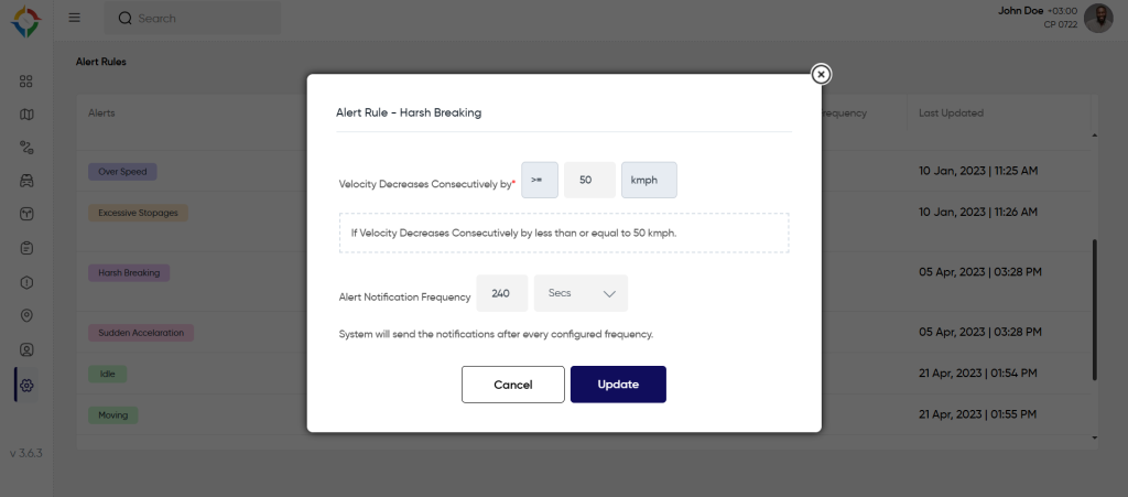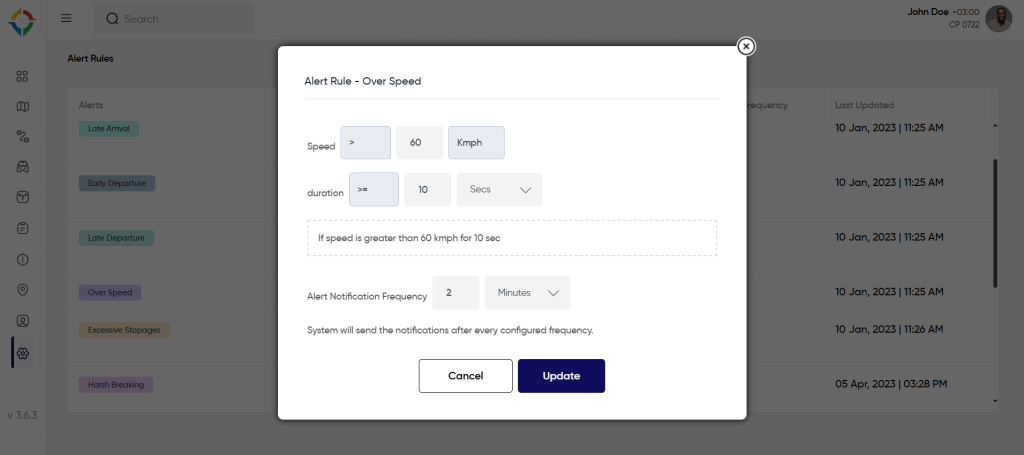 Each alert will have a distinct rule that will be applied to the vehicles. Users will define the rule in this section according to the needs of the company. To define the rule, users need to click on the alert name and the rule will open in a pop up where users need to enter required values.