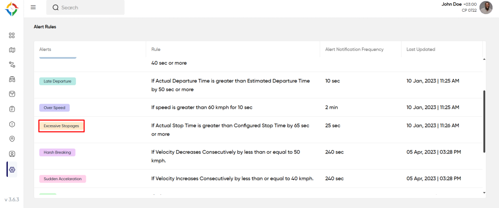 Step 1: Click on the “Excessive Stoppages” from the “Alert Rules” list screen as shown below: