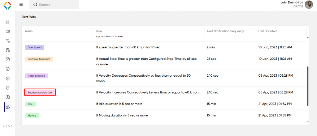 Step 1: Click on the “Sudden Acceleration” from the “Alert Rules” list screen as shown below: