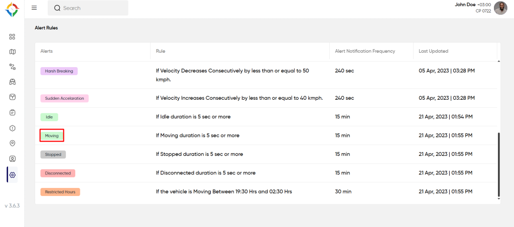 Step 1: Click on the “Moving” from the “Alert Rules” list screen as shown below: