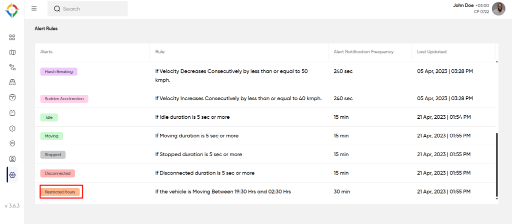 Users will get notified of the “Restricted Hours” alert If the vehicle is Moving Between 19:30 Hrs and 02:30 Hrs. To know how to set the rule, follow the below steps: